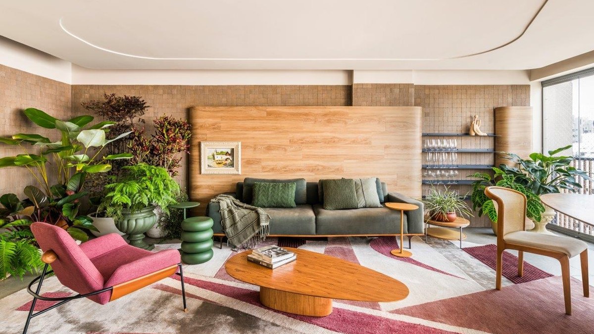 O projeto apostou na sobreposição de texturas e contrastes . O teto em gesso dialoga com a laje revestida em vinílico que imita madeira, enquanto paredes combinam materiais naturais e sintéticos, destacando-se o revestimento cerâmico artesanal e o painel vinílico da sala. Na cozinha, a marcenaria rosa em tom claro se insere na paleta quente do apartamento, sendo um dos grandes destaques visuais.
