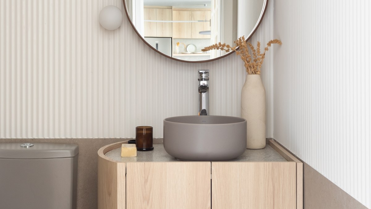 A cuba de apoio é uma excelente opção para lavabos com metragens reduzidas, pois não ocupa muito espaço dentro do armário. Outra opção é a cuba de embutir, que oferece um visual clean e ocupa menos área na bancada.